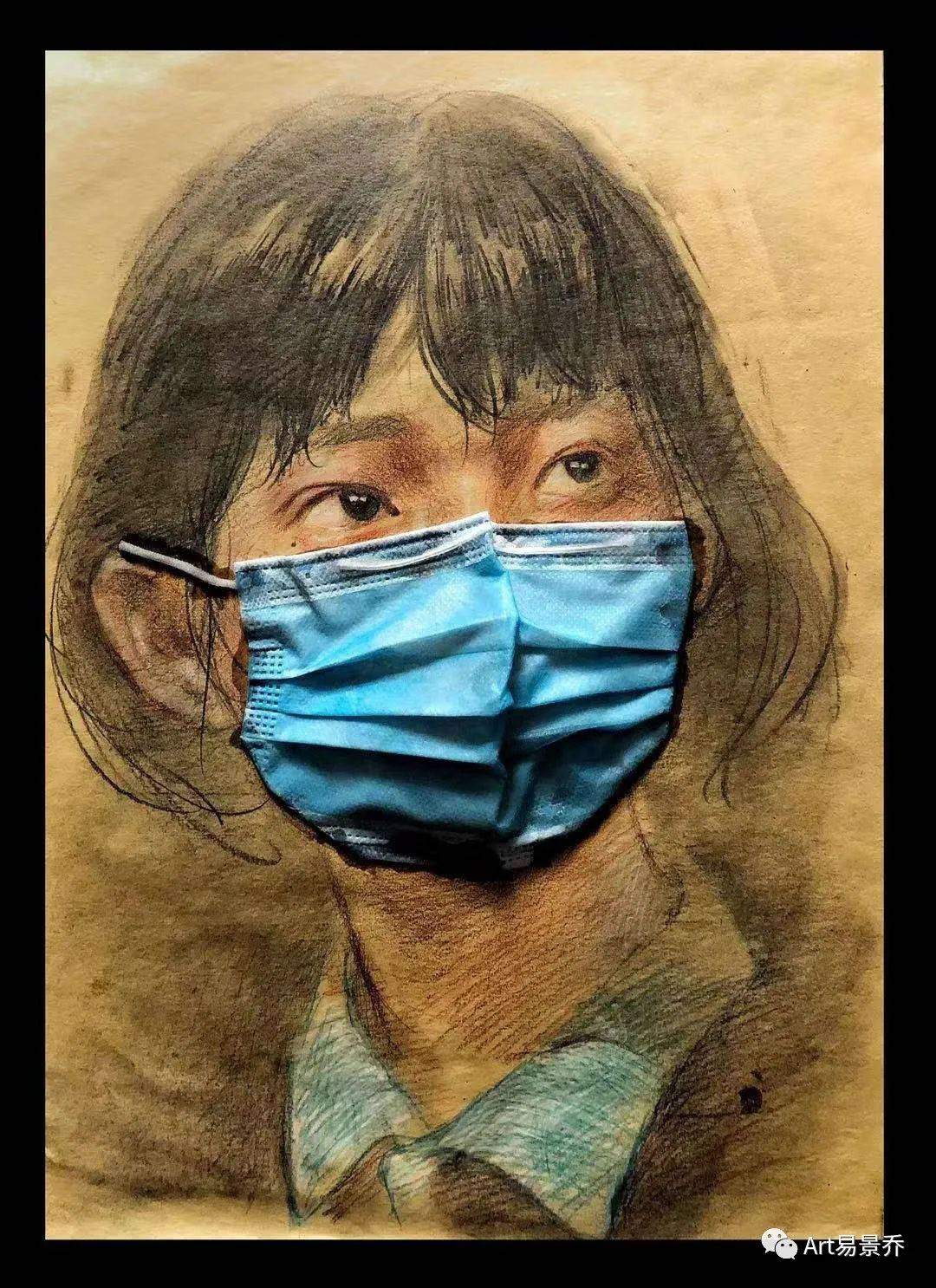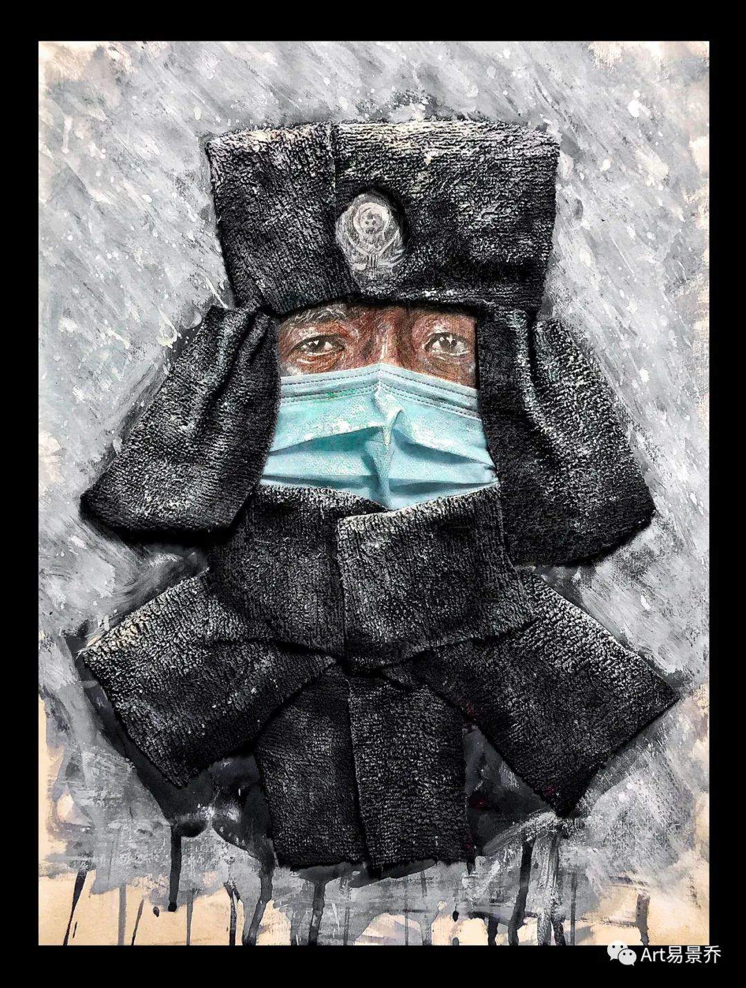 近日,必赢242net官网美术学院本科2018级雕塑专业学生刘昱伽在家中拿起画笔,利用废弃口罩、旧抹布、旧报纸、包装袋等材料,创作出了一幅幅感人的画作。