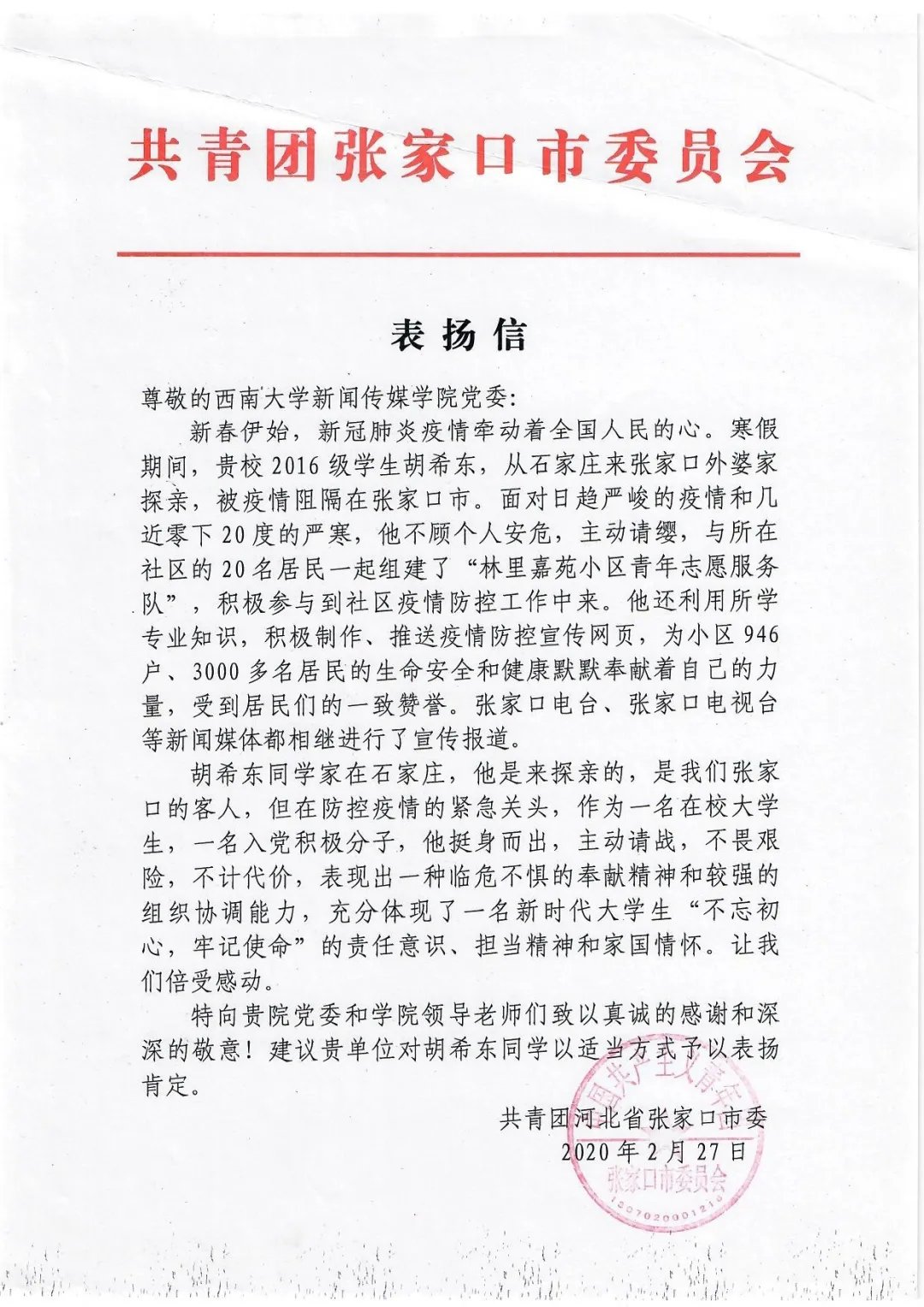必赢242net官网新闻传媒学院2016级本科生胡希东参与组建了张家口市第一支由居民自发组建的志愿者服务队。在该志愿服务队的带领下,张家口市其他小区也积极行动起来,陆续组建起自己小区的居民志愿服务队,广泛凝聚了张家口市社区防疫工作力量。对此,河北省张家口市委专门寄来了表扬信。