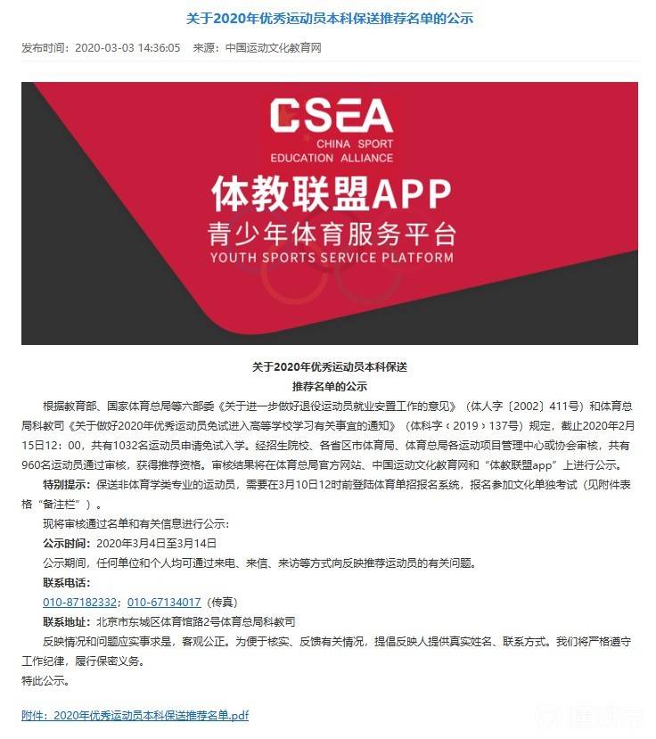 据悉,该名单将在体育总局官方网站、中国运动文化教育网和“体教联盟app”上进行公示,公示时间为3月4日至3月14日。