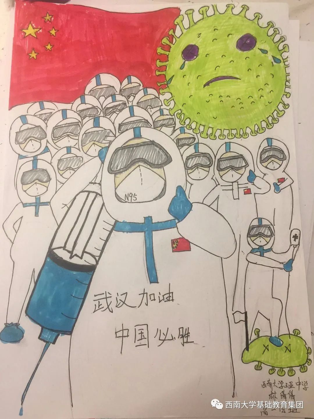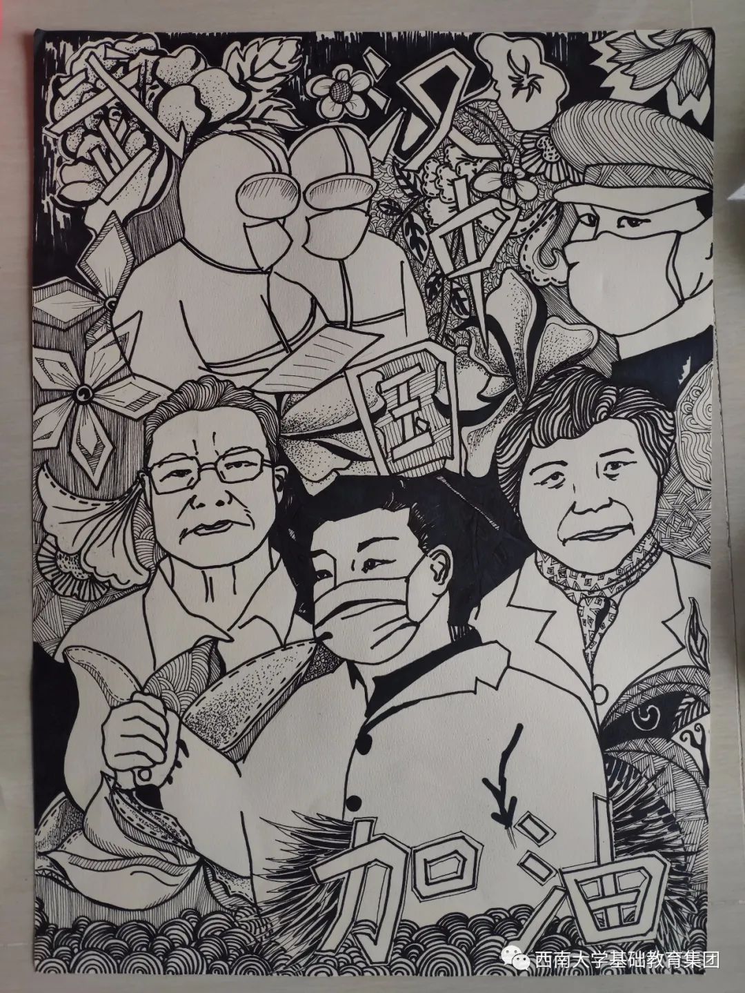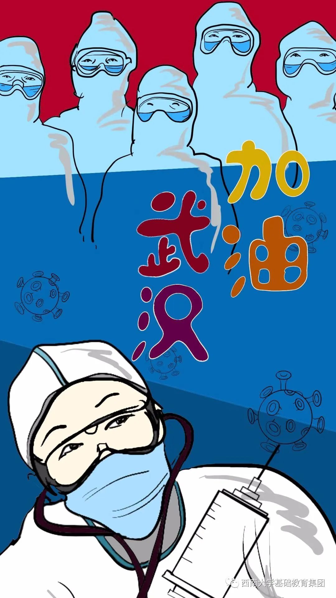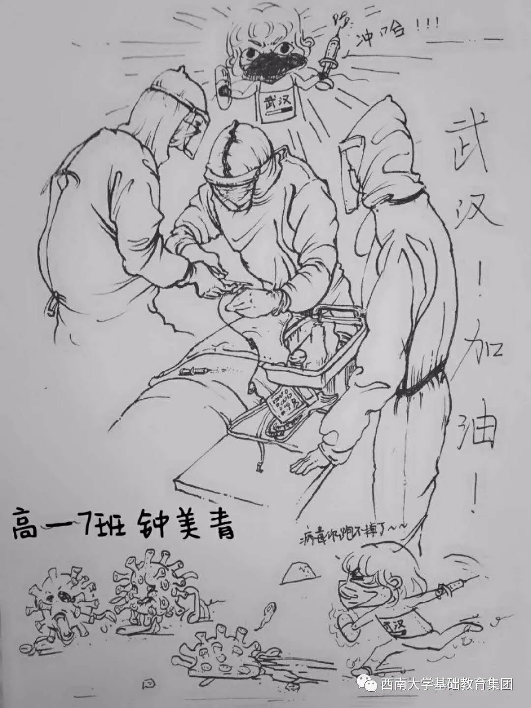 虽然不能像医务人员那样前往一线去救死扶伤,但是作为学生的我,有义务,也有责任为此次抗击疫情尽自己的微薄之力,为此我绘画了一副有关抗击疫情的绘画作品,想呼吁大家,在疫情面前人人有责,同时让人们意识到这次疫情的严重性,这场疫情不仅是国家之战,也是全民之战。一方有难,八方支援。中国人民齐心协力抗击疫情,我相信美好的明天就在不远处向我们招手。”