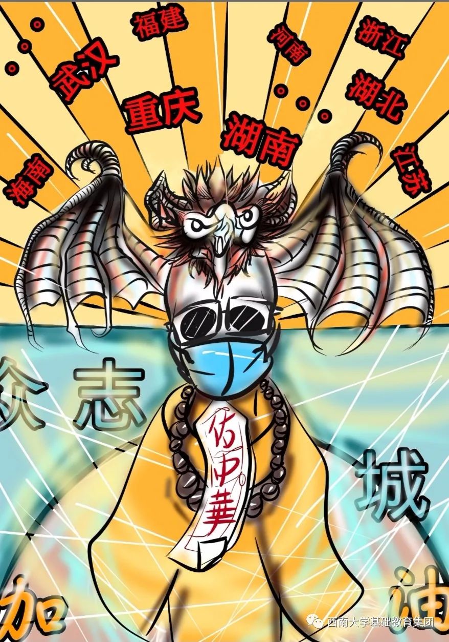 由于新型冠状病毒给武汉及全国各族人民带来了一系列影响和伤害,迫使人们关门闭户,惶恐难安。武汉各医院人满为患,医生、护士、警察、军人,科研专家等纷纷前往武汉救援,一批批物资运行通畅,如此震撼场面催人落泪,倍感安慰!此画传达的是一种积极向上的精神,画的中央是一个手握国旗的小天使,代表着武汉人民坚强勇敢,对祖国感恩自信的意念!下方托举小天使的是伟大的医护人员,他们任劳任怨,坚持一线和病毒作战,有他们在,武汉定会解除封印,自由飞翔。右上角的和平鸽嘴刁爱心,代表万物生灵来为武汉加油,为中国加油。小天使头顶的光芒指希望的曙光,希望武汉恢复生机,希望中国人民团结致志,共抗病魔,希望人类从此保护环境,爱惜动物,和动物和谐相处,让爱散发希望的光芒!