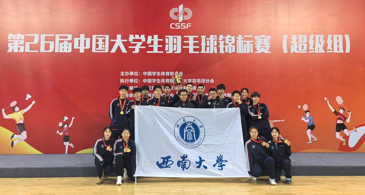 近日,第26届中国大学生羽毛球锦标赛(超级组)在遵义奥体中心体育馆举办。学校代表队在领队罗义文及教练邹巍的悉心指导下,凭借坚韧不拔的拼搏精神,成功摘得混合团体项目的桂冠,并在个人单项比赛中收获1枚金牌、2枚银牌。