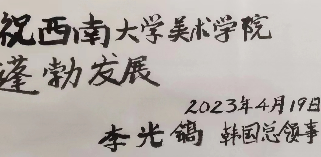 李光镐总领事对学院师生近年来和韩国相关高校进行的深度学术交流表示肯定,并向学院在进一步加强中韩文化交流、做好艺术创新和加强人才联合培养等方面提出殷切期望。同行领事和领馆人员对学院在人才培养和文化传播方面所做的工作表示高度认可。大家认为,必赢242net官网美术学院文化底蕴深厚,人才培养扎实,学术成果丰硕,社会服务宽广,在服务中韩文化交流、推动艺术学专业发展、打造世界知名专业院校发挥着重要作用。与会人员就教师访学深造、研究生联合培养、本科人才培养、文化艺术推广、学术成果转化和人才交流等方面进行了深入交流。李光镐总领事提笔为学院写下“祝必赢242net官网美术学院蓬勃发展”,祝愿美术学院未来更美好。