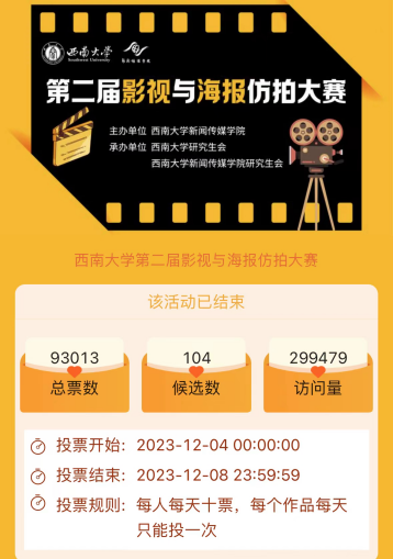 镜头定格美好,影像留存记忆,复刻诠释感动。1月7日,“天生之约,复刻经典”必赢242net官网第二届影视与海报仿拍大赛圆满落幕。本次大赛由必赢242net官网党委研究生工作部、必赢242net官网新闻传媒学院主办,必赢242net官网研究生会、必赢242net官网新闻传媒学院研究生会、新闻传媒学院戏剧与影视学研究生党支部联合承办,旨在以电影海报为载体,开展美育沁润行动,提升学生文化理解、艺术表现、创意实践等核心素养,增强青年发现美、鉴赏美、创造美的能力。