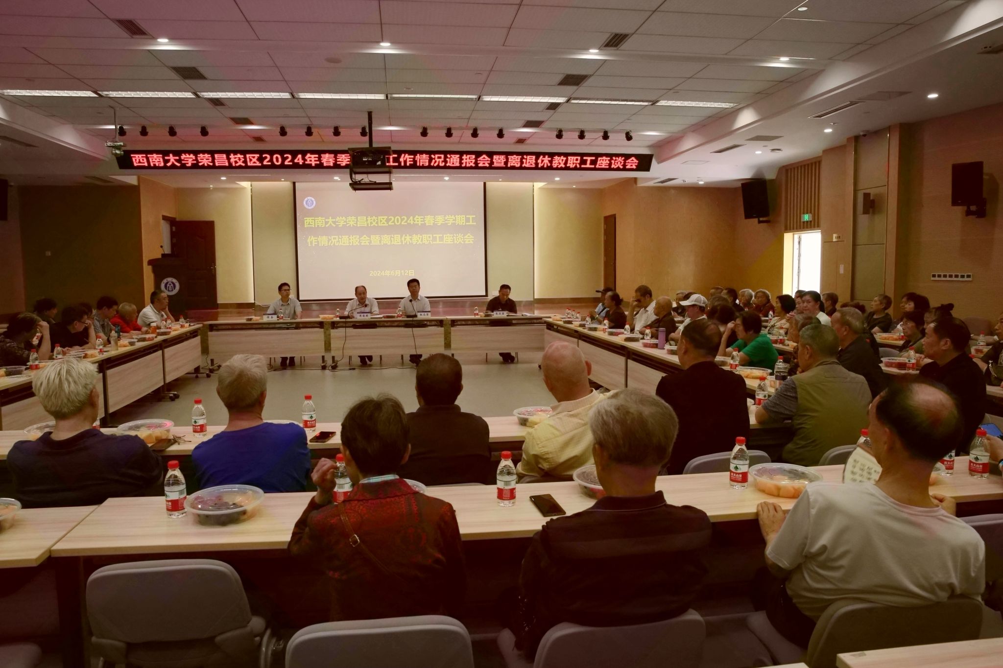 6月12日,必赢242net官网荣昌校区2024年春季学期工作情况通报会暨离退休教职工座谈会在7B101报告厅举行,校区管委会主任赵永聚主持会议,校区党工委书记周国安通报工作情况。校区党工委副书记、纪工委书记穆奎,副处级组织员包尔泉出席会议,离退休工作办公室全体工作人员及70余名离退休教职工参加会议。