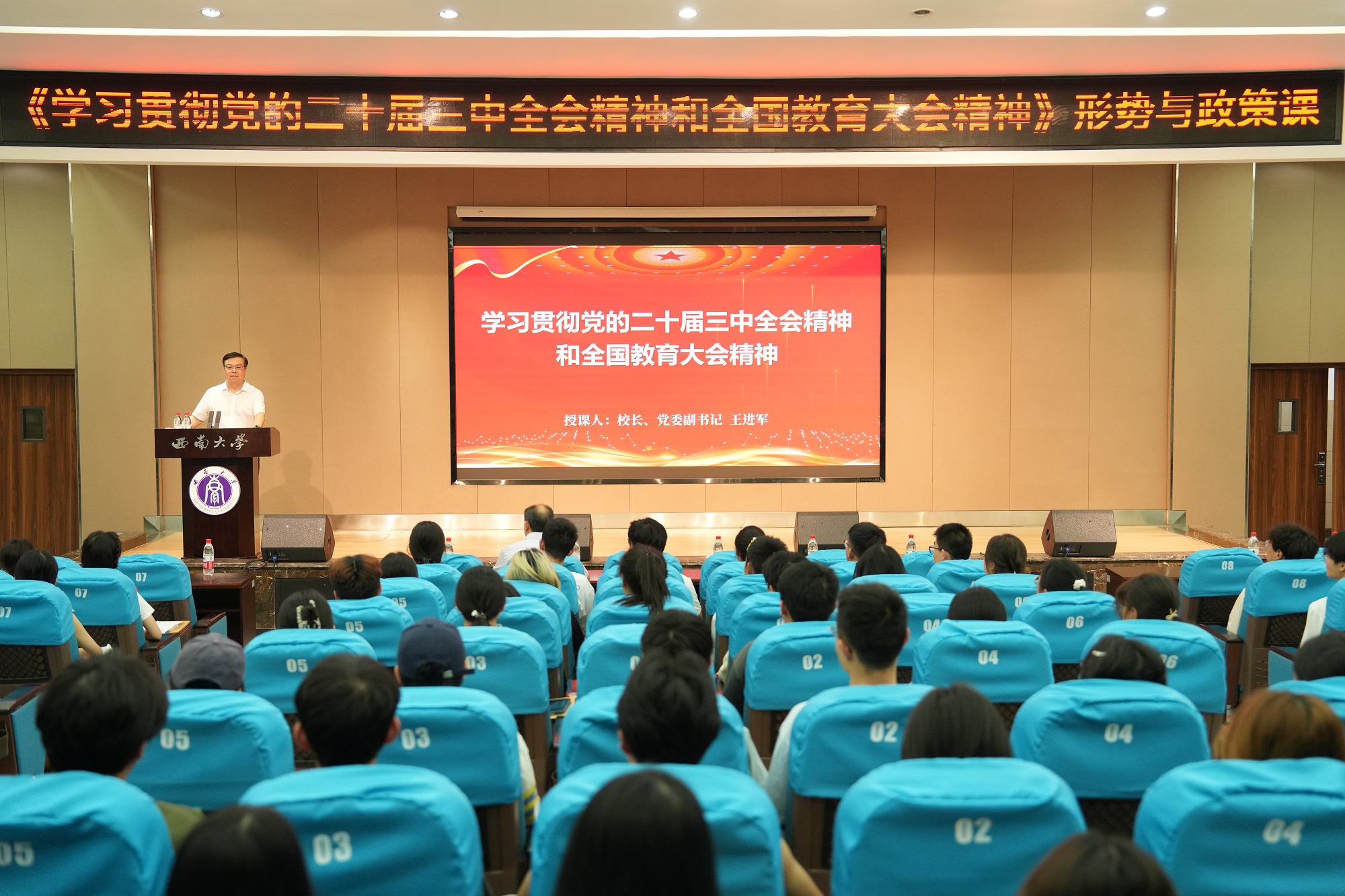 9月27日下午,校长、党委副书记王进军教授,副校长葛信勇研究员赴荣昌校区,为不同年级本科生讲授形势与政策课,授课内容为学习贯彻党的二十届三中全会精神和全国教育大会精神。